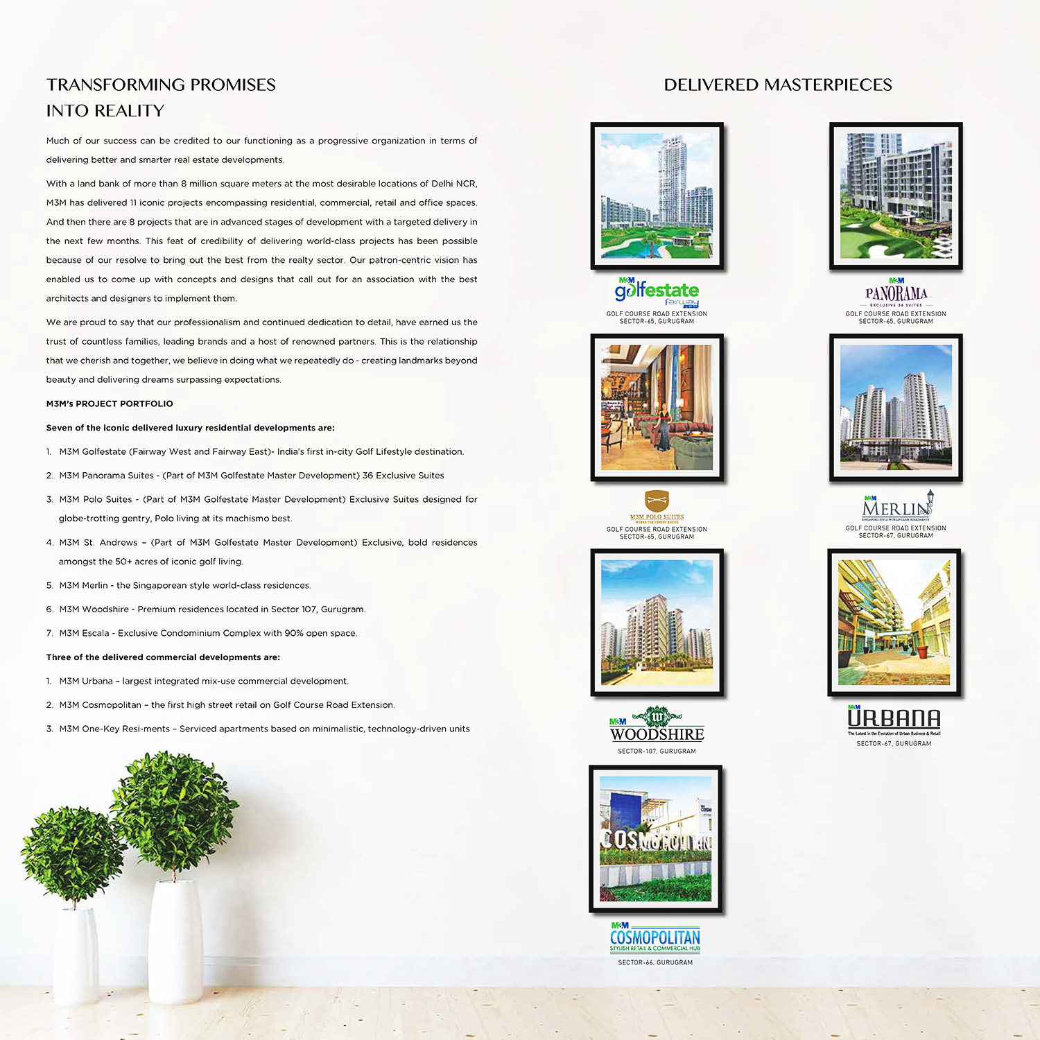 Disclaimer:- Welcome to M3M Sky Homes (“Website”). The contents of this website are for general informational purposes only. By using or accessing this Website and/or the hyperlinks embedded/ mentioned in the Website you agree to abide by the terms and conditions, as set forth herein and as contained in the Website without any qualification or limitation. In the event you do not accept/ agree to the terms of this Disclaimer, you are requested not to use the Website or download materials from the Website. Every endeavor has been made to keep the information updated. However, we make no representations or warranties of any kind, express or implied, about the completeness, accuracy, reliability, suitability or availability with respect to the Website or the information, products, services, or related graphics contained in the Website for any purpose. The Website and all its content are provided on an “as is” and “as available” basis and is intended for informational purposes only. No information given under this Website shall be treated as a warranty or representation by us. Your use of the Website is solely at your own risk. This Website is for guidance only. It does not constitute part of an offer or contract. The contents, including design and specifications are subject to change without prior notice. Computer generated images are the artist’s impression and are an indicative of the actual designs. By using and/or accessing this Website, you, the viewer/user acknowledge that the information including any material/ documents (such as brochures and marketing collaterals) on this Website are solely for informational purposes and you have not relied on this information for making any booking/ purchase/ intention to purchase/ invest in any project(s) of M3M Sky Homes and/or its affiliates. Nothing herein shall be construed as any invitation, or offer for investment or deposit within the terms of the applicable law (as amended from time to time) including without limitation SEBI Act, 1992, Companies Act 2013 etc. and we shall not be liable for any consequence of any action taken by the viewer relying on such material/ information on this Website. The particulars contained on the Website mention details of Projects/ developments undertaken by M3M Sky Homes and/or its affiliates. The contents are being modified in terms of the stipulations/ recommendations under the Real Estate Regulation Act, 2016 and Rules made thereunder (“RERA”) and accordingly may not be fully in line thereof as of date. Use of information shall be governed by Indian laws, RERA; subject to jurisdiction of Competent Authority under RERA, courts at Gurugram/ Haryana India. You are further advised to verify all the details, including area, amenities, services, terms of sales and payments and other relevant terms independently with the sales team independently, subject to prior appointment during working hours and speak to one of our sales staff, prior to concluding any decision for buying any unit(s) in the said project. In no event shall M3M Sky Homes, its affiliates, employees, directors and/or officers be made liable for any claim as a result of any inaccuracies in the information provided in this Website, though all efforts have to be made to ensure accuracy and under no circumstances shall we be liable for any expense, loss or damage including, without limitation, indirect or consequential loss or damage, or any expense, whatsoever arising from use, or loss of use, of data, arising out of or in connection with the use of this Website.